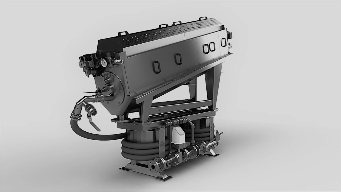 The sludge dewatering screw press (NSP) uses a wedge-wire drum combined with a unique hose flocculator to separate solids from liquids efficiently. As sludge enters the system, it is conditioned by the hose flocculator, ensuring consistent floc formation even when sludge characteristics vary.